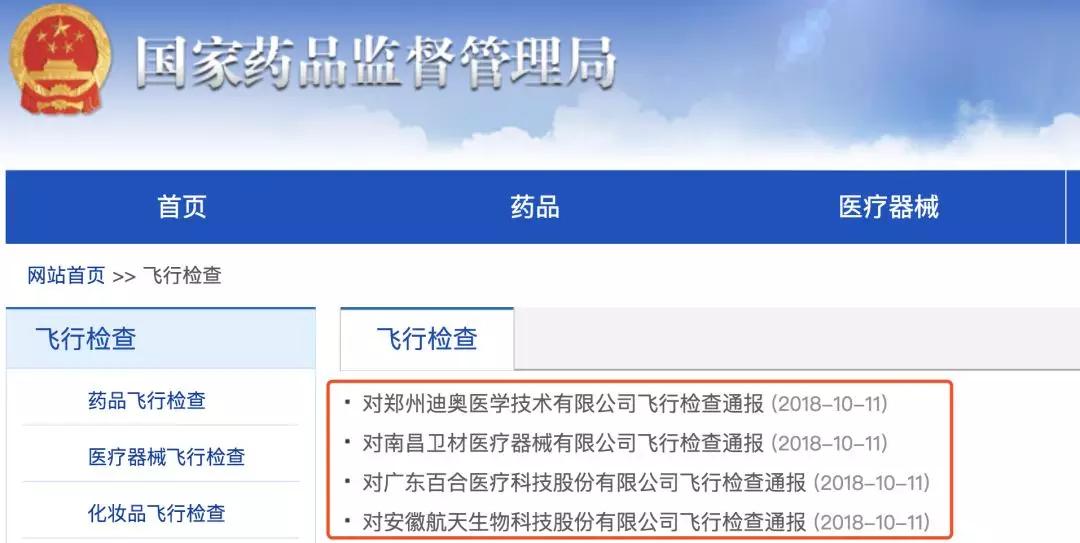 根據(jù)通報,4家被飛檢的公司分別是鄭州迪奧醫(yī)學技術(shù)有限公司、南昌衛(wèi)材醫(yī)療器械有限公司、廣東百合醫(yī)療科技股份有限公司、安徽航天生物科技股份有限公司。