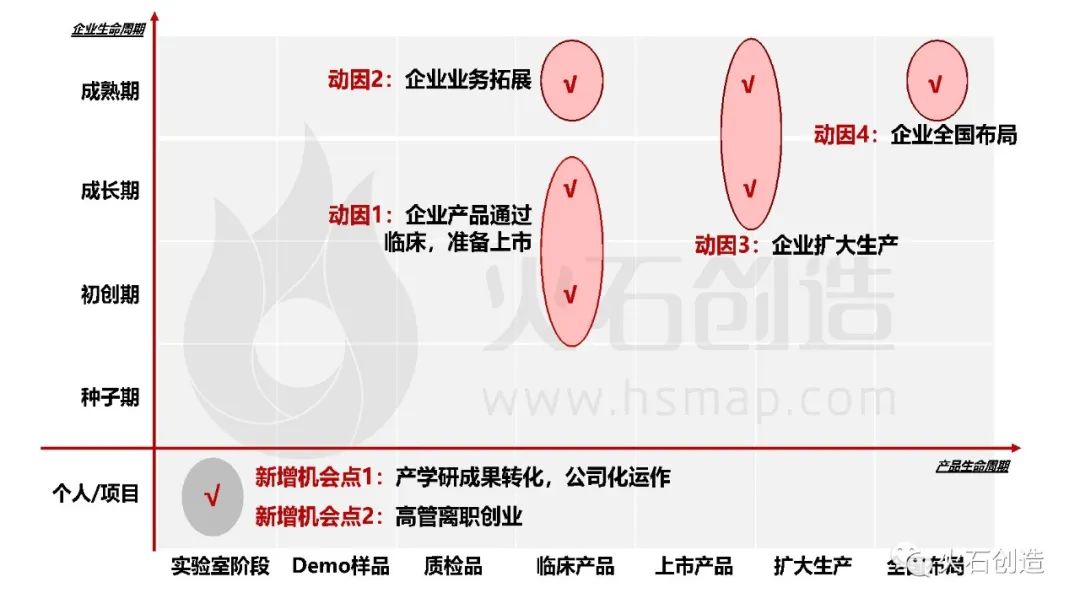 從企業(yè)生命周期來(lái)看,處于不同生命周期的企業(yè)都會(huì)有投資選址的需求。從企業(yè)發(fā)展所處的階段,我們可以把生物醫(yī)藥和醫(yī)療器械企業(yè)投資選址行為按照企業(yè)規(guī)模的維度,劃分為四種類型:孵化辦公室選址,小規(guī)模產(chǎn)業(yè)化租用廠房選址,(大型)企業(yè)規(guī)?;越◤S房選址以及區(qū)域中心選址。