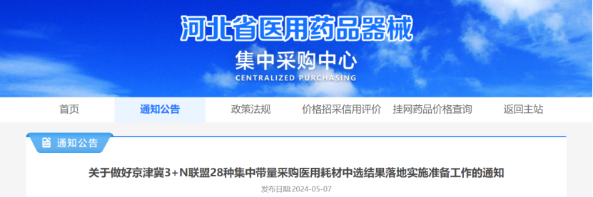 5月7日, 河北省醫(yī)用藥品器械集中采購中心發(fā)布《關(guān)于做好京津冀3+N聯(lián)盟28種集中帶量采購醫(yī)用耗材中選結(jié)果落地實(shí)施準(zhǔn)備工作的通知》(以下簡稱《通知》),其中明確,28種醫(yī)用耗材中選結(jié)果擬定于2024年5月15日在河北省落地實(shí)施。