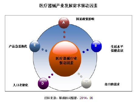 賽迪顧問發(fā)布《中國醫(yī)療器械產(chǎn)業(yè)發(fā)展戰(zhàn)略研究(2014)》。報(bào)告顯示,我國醫(yī)療器械有著廣闊的市場(chǎng)空間,國家政策、經(jīng)濟(jì)生活水平和人們保健意識(shí)的提高、人口老齡化、產(chǎn)品出口和產(chǎn)品更新?lián)Q代等因素均對(duì)醫(yī)療器械產(chǎn)業(yè)發(fā)展形成較大影響。