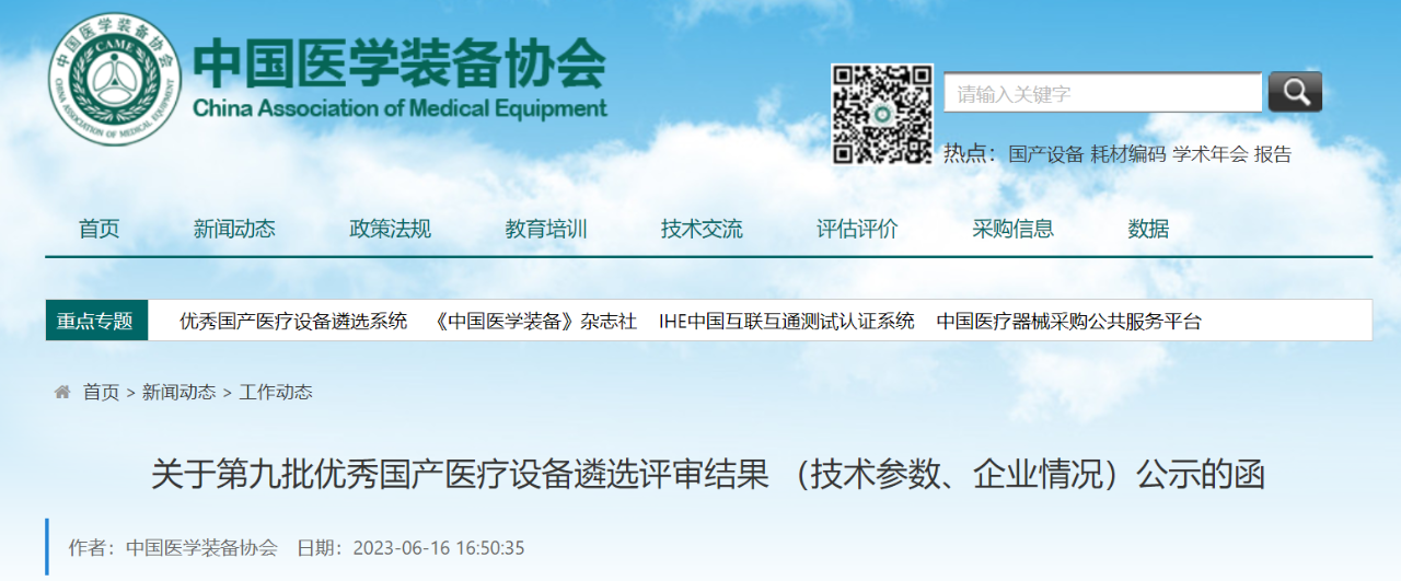 近日,中國醫(yī)學(xué)裝備協(xié)會公示了第九批優(yōu)秀國產(chǎn)醫(yī)療設(shè)備產(chǎn)品遴選評審結(jié)果。