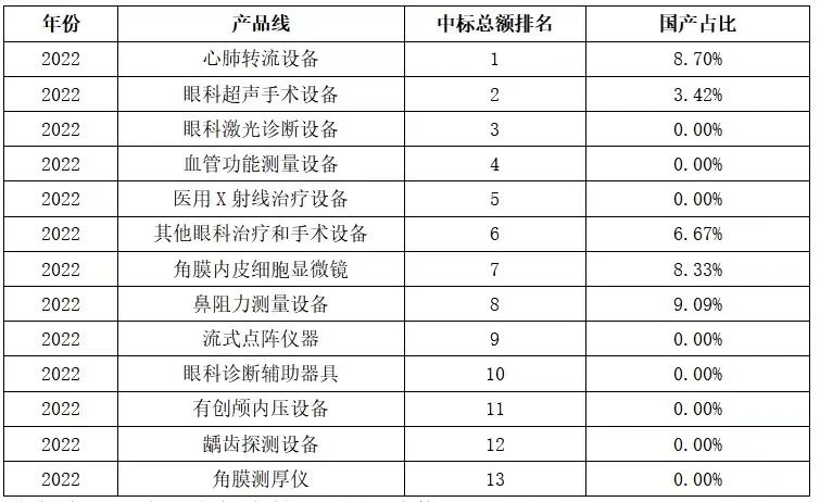 據(jù)眾成數(shù)科統(tǒng)計,在2022年我國國產(chǎn)產(chǎn)品公開中標(biāo)金額低于10%的產(chǎn)品共有13項,相比較去年減少了2個。從具體產(chǎn)品線來看,心肺流轉(zhuǎn)設(shè)備中標(biāo)金額位居首位,眼科超聲手術(shù)設(shè)備和眼科激光診斷設(shè)備分居第二、三位。