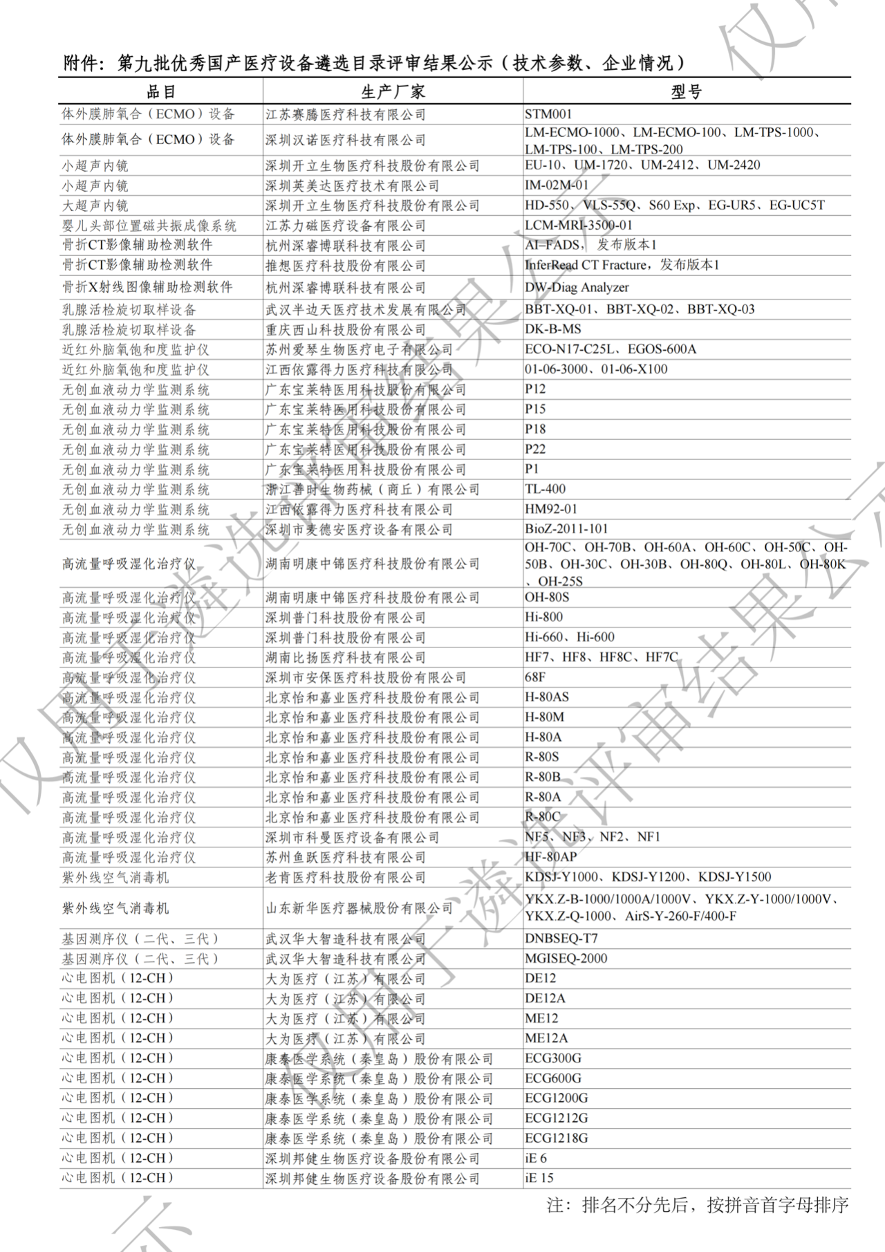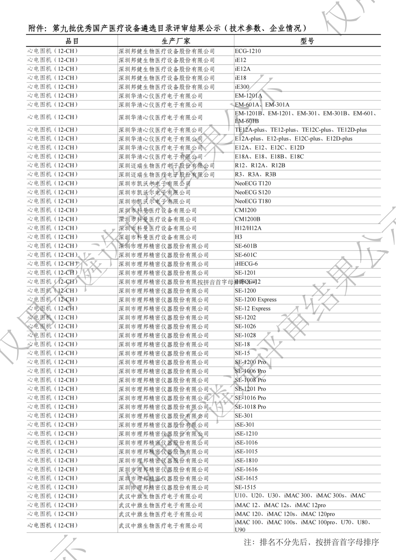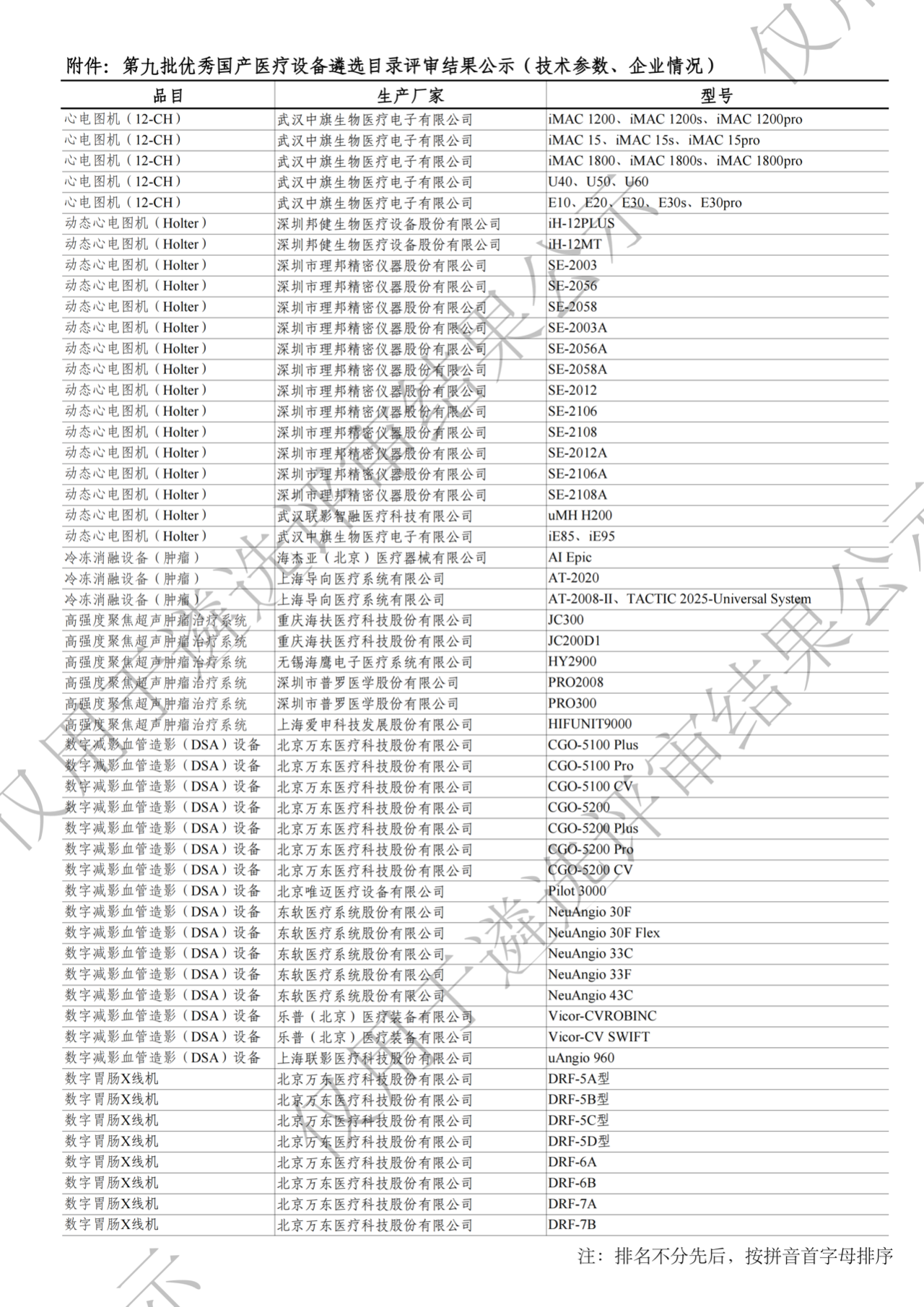 心電圖機(12-CH)、動態(tài)心電圖機(Holter)、醫(yī)用電子直線加速器、γ-射線立體定向治療系統(tǒng)、高強度聚焦超聲腫瘤治療系統(tǒng)、數(shù)字減影血管造影(DSA)設(shè)備、清洗消毒設(shè)備(壓力蒸汽滅菌消毒、全自動清洗消毒、脈動真空清洗消毒、環(huán)氧乙烷滅菌、過氧化氫低溫等離子滅菌、軟式內(nèi)鏡清洗消毒、翻蓋式全自動軟式內(nèi)鏡清洗消毒、超聲波清洗)、化學(xué)發(fā)光免疫分析儀(全自動、小型全自動、單人份、便攜式4個子品目)、全自動酶聯(lián)免疫分析儀(微板)、冷凍消融設(shè)備(腫瘤)、超聲骨刀、SPECT、數(shù)字胃腸X線機、口腔CT設(shè)備、心肺復(fù)蘇機、醫(yī)用制氧機、超聲光散射乳腺診斷系統(tǒng)、康復(fù)設(shè)備(定位牽引系統(tǒng)、振動排痰系統(tǒng)、吞咽神經(jīng)和電刺激儀、空氣波壓力治療儀、激光磁場理療儀、脊柱定位減壓系統(tǒng))、眼底照相機、飛行時間質(zhì)譜儀、實時熒光定量PCR儀(全自動、便攜式)、全自動核酸提取儀、全自動血型分析儀。