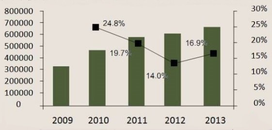 從2009~2013年的數(shù)據(jù)來看,國內(nèi)支架數(shù)量的使用仍在逐年上升,這個(gè)“蛋糕”仍在發(fā)酵膨脹,但膨脹速度有所放緩(圖3)。