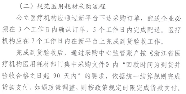 《浙江省“三流合一”醫(yī)用耗材采購新平臺推進(jìn)工作方案》明確提出,“回款時間為到貨并驗收合格之日起90天內(nèi)”。