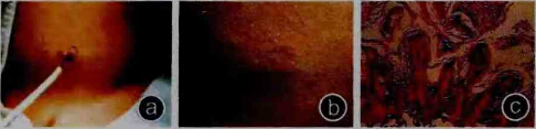 c.病理檢查提示:過度角化型脂溢性角化癥(HE染色.X200)