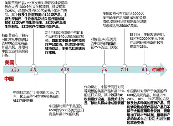 一、中美貿(mào)易戰(zhàn)對(duì)我國(guó)生物醫(yī)藥行業(yè)出口的影響尚未顯現(xiàn),短期內(nèi)增加關(guān)稅對(duì)我國(guó)生物醫(yī)藥行業(yè)出口的整體影響有限,從長(zhǎng)期來(lái)看,貿(mào)易戰(zhàn)未來(lái)或?qū)⒅萍s我國(guó)高端醫(yī)療器械的發(fā)展