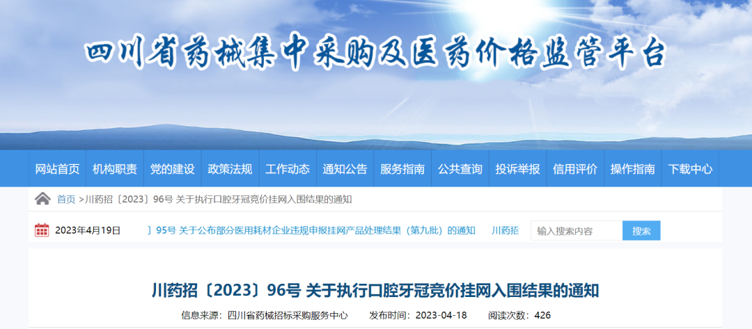 4月19日,四川省藥械招標采購服務(wù)中心發(fā)布關(guān)于《川藥招〔2023〕96號 關(guān)于執(zhí)行口腔牙冠競價掛網(wǎng)入圍結(jié)果的通知》(簡稱《通知》)。