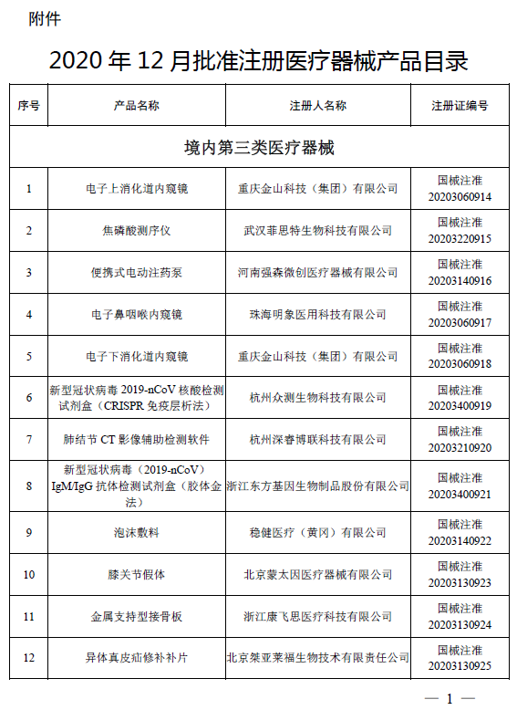 附件:2020年12月批準(zhǔn)注冊(cè)醫(yī)療器械產(chǎn)品目錄