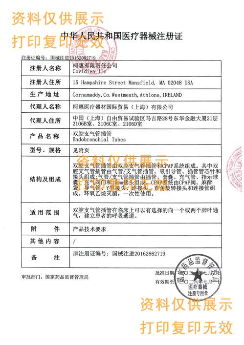 美國柯惠雙腔支氣管插管由雙腔支氣管插管和CPAP系統(tǒng)組成。其中雙腔支氣管插管由氣管/支氣管插管、吸引導(dǎo)管、插管管心針和接頭組成;氣管/支氣管插管由插管、套囊、充氣管、指示球囊、充氣閥門和15mm接頭組成。CPAP系統(tǒng)由CPAP閥、麻醉袋、導(dǎo)氣管、Y型接頭、連接頭、直角旋轉(zhuǎn)接頭和連接管組成。環(huán)氧乙烷滅菌,一次性使用