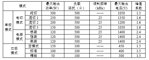 ●本手術設備的單極模式包含單極電切和單極電凝模式,其中電切模式包含純切、混切1、混切2和混切3,輸出功率均可調。