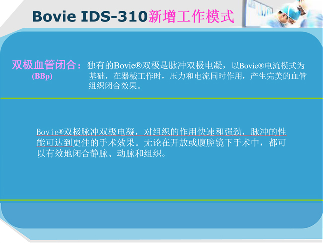 美國Bovie新一代數(shù)字高頻電刀IDS-310專為臨床醫(yī)生設(shè)計(jì),提供了一個安全、用戶界面友好,能夠滿足所有手術(shù)室程序的性能要求。這一創(chuàng)新的技術(shù)基于高頻電刀主機(jī)提供了輸出的13種模式。包括新一代的Bovie雙極,自動雙極和特殊的腹腔鏡手術(shù)模式。這些功能為外科手術(shù)的應(yīng)用和操作提供了所需要的強(qiáng)大能量源,為醫(yī)生選擇不同電外科手術(shù)效果,提供了最大方便性和安全性!