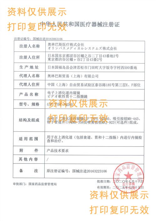 該產(chǎn)品由電子結(jié)腸鏡(CF-H190L和CF-H190I)和附件組成,附件包含吸引按鈕(MH-443)、送氣送水按鈕(MH-438)、鉗子管道開口閥(MB-358)。性能參數(shù):分辨率≥3.51Lp/mm。照度:在工作距離處,照度應(yīng)不小于8000lx。視場角:170°±15%景深:2mm~100mm。送水量:送水量不得小于45ml/min。吸引量:吸引量不小于400ml/min。送氣量:送氣量≥800ml/min。彎曲角:彎曲角:上:180°;下:180°;右:160°;左:160°(允差:±10%)。