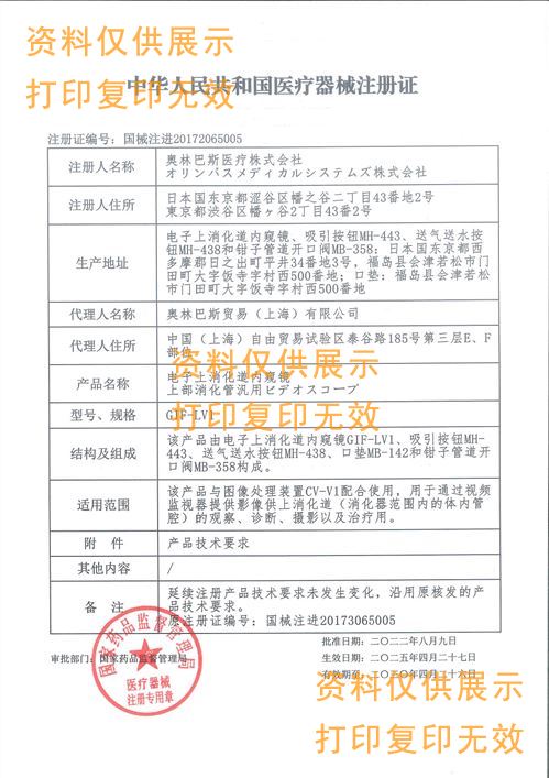 該產(chǎn)品由電子結(jié)腸鏡(CF-H190L和CF-H190I)和附件組成,附件包含吸引按鈕(MH-443)、送氣送水按鈕(MH-438)、鉗子管道開口閥(MB-358)。性能參數(shù):分辨率≥3.51Lp/mm。照度:在工作距離處,照度應(yīng)不小于8000lx。視場角:170°±15%景深:2mm~100mm。送水量:送水量不得小于45ml/min。吸引量:吸引量不小于400ml/min。送氣量:送氣量≥800ml/min。彎曲角:彎曲角:上:180°;下:180°;右:160°;左:160°(允差:±10%)。